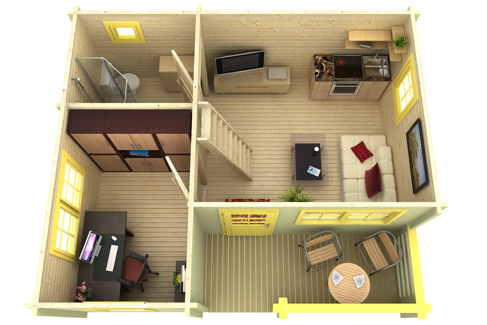 Die Lieferung des Ferienhaus Falun 70-B Iso mit Schlafboden erfolgt als unbehandelter Bausatz mit Befestigungsmaterial, Fundamentplan und Montageanleitung. Im Wochenendhaus Bausatz ist keine Dachpappe, Einrichtung oder Dekoration enthalten.
