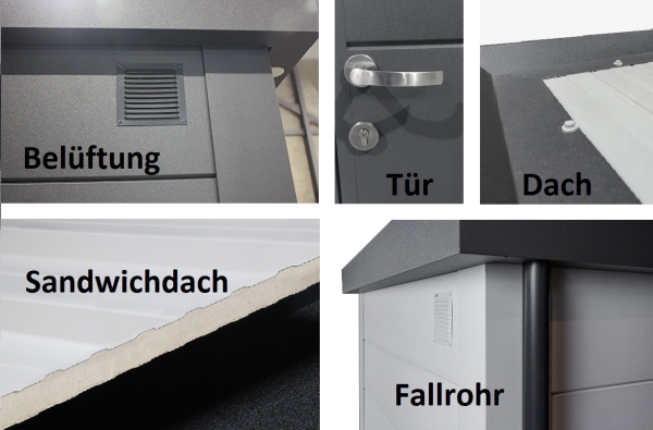 - Innenwandpaket: 0,6 mm starkes, beschichtetes Material mit Lüftung in lichtgrau