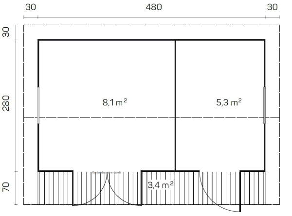 Fenster und Türen = Einbaumaße (B x H). Die Lieferung des Stufendach Gartenhaus Eva 70-Iso erfolgt als unbehandelter Bausatz mit Befestigungsmaterial, Fundamentplan und Montageanleitung. Es ist keine Dachpappe oder Dekoration in der Lieferung enthalten.